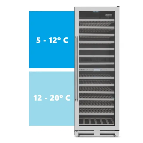 Descubra a excelência da adega "Tecno", projetada para preservar seus vinhos com perfeição. Com duas zonas de temperatura, ela mantém todos os tipos de vinhos em suas condições ideais, variando de 5 °C a 20 °C. A tecnologia avançada garante controle preciso de temperatura e um ambiente livre de vibrações.