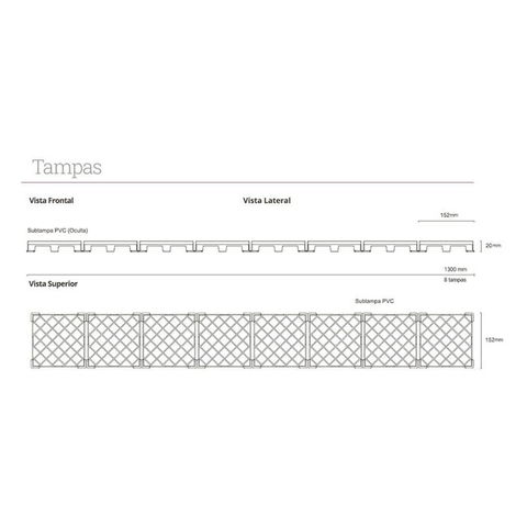 | Conteúdo | Contém 08 subtampas de PVC com 15 cm x 15 cm (permite seguir a paginação do revestimento/pisco). |