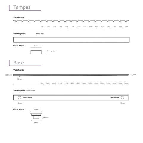 | Detalhes da Base | Base com 02 saídas laterais de 50mm com eixo a 10,5cm das laterais da base |