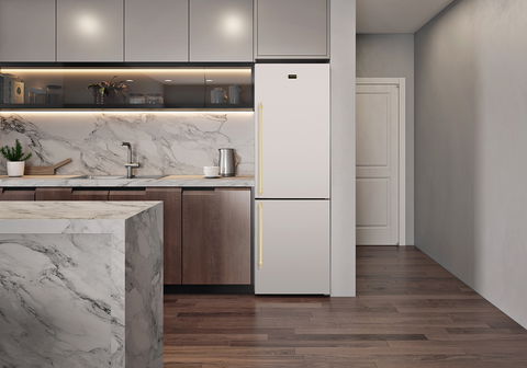 Descubra o requinte do Refrigerador Tecno Vintage TR32 BXDB V2, um modelo de piso e embutir com design sofisticado. Com portas de aço inox anti-manchas e puxadores tubulares em latão polido, este refrigerador garante uma integração perfeita na sua cozinha planejada, sem necessidade de frestas de ventilação. Elegância e funcionalidade em um só produto.